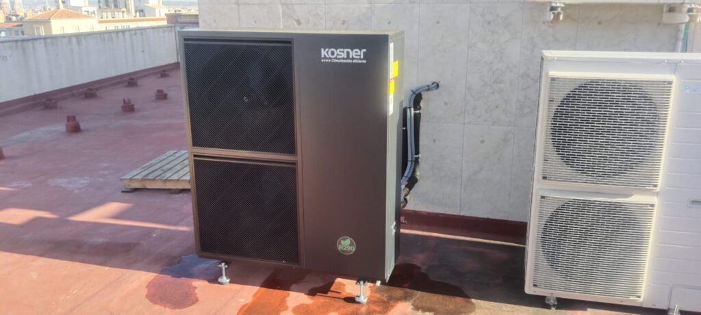 - Instalación de un sistema de aerotermia para satisfacer la producción del 100% de las necesidades de ACS del edificio, formado por una bomba de calor y un nuevo depósito para la producción de ACS.